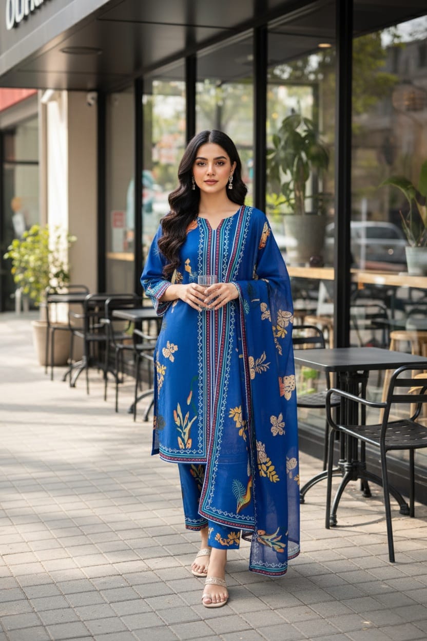 Crafted from premium digital print fabric, this outfit set includes a dupatta, bottom, and kurta — all beautifully coordinated.