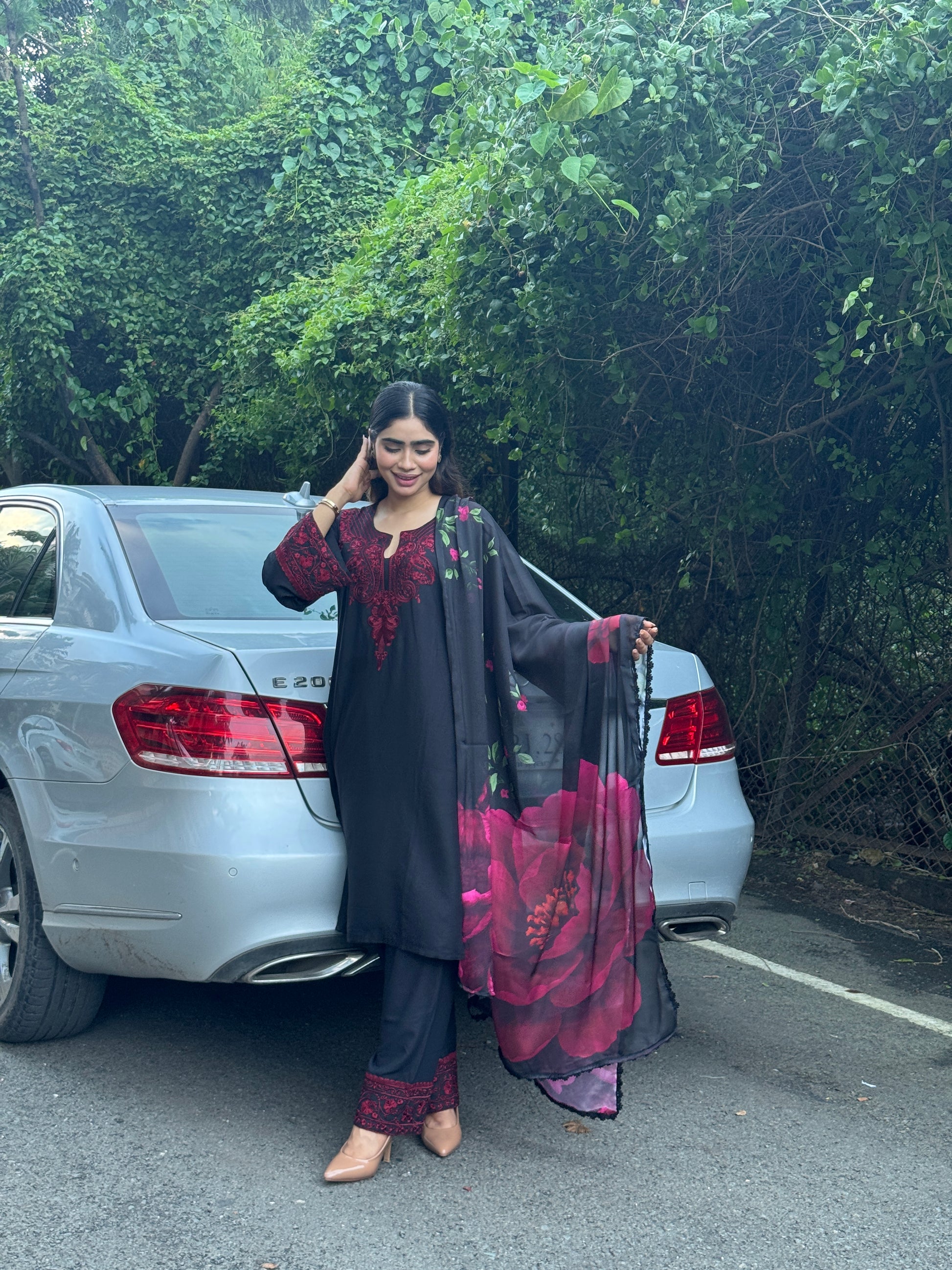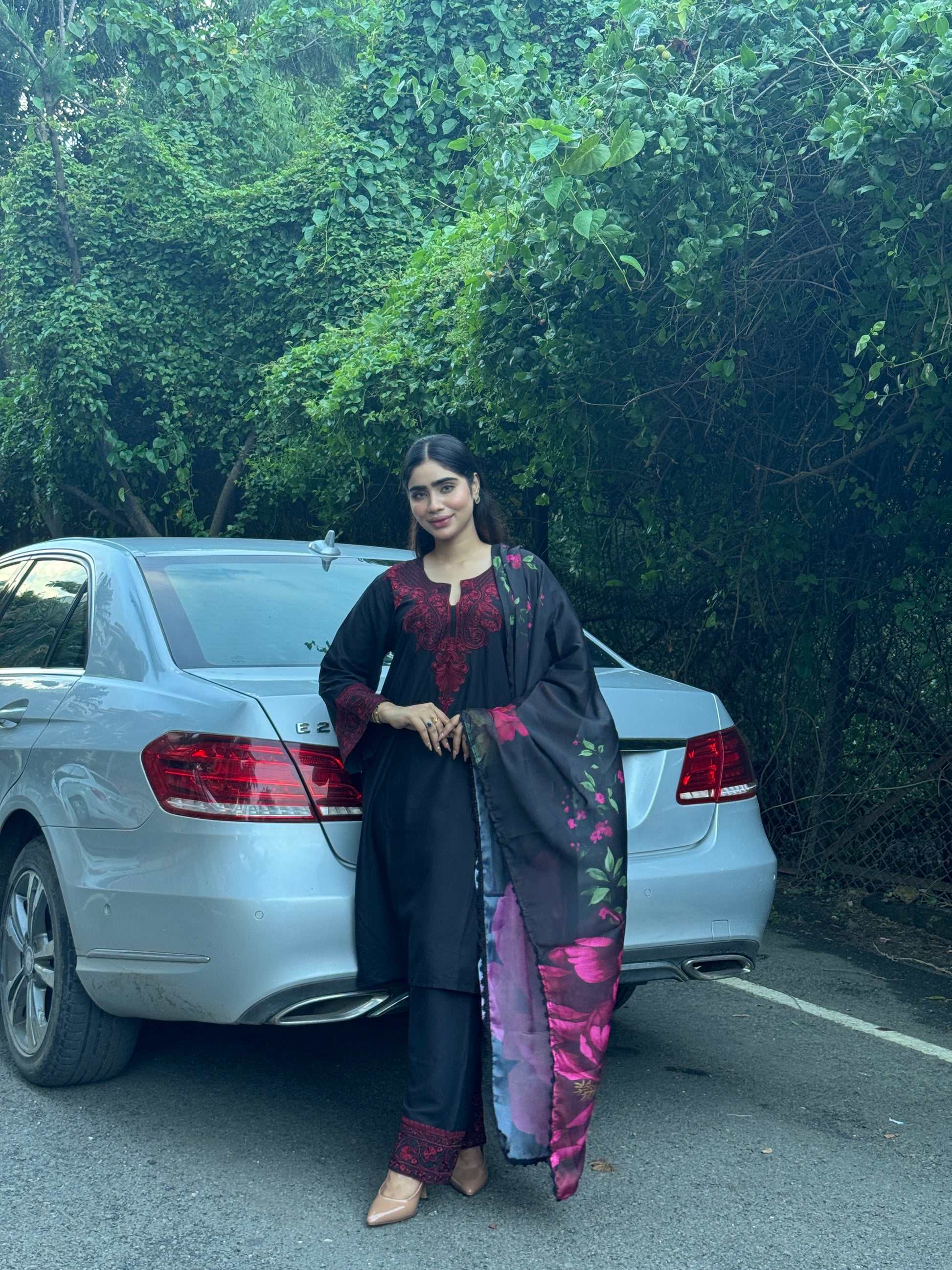 Crafted in deep black with rich maroon embroidery, this outfit defines effortless sophistication.
